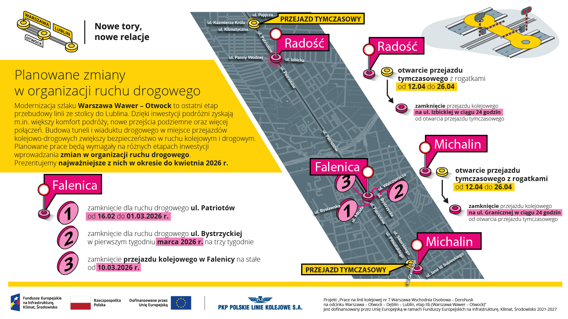 Kolejne zmiany nastąpią w kwietniu. W Radości oraz Michalinie uruchomione zostaną tymczasowe przejazdy kolejowo-drogowe z rogatkami, a po 24 godzinach zamknięte zostaną istniejące przejazdy na ul. Izbickiej w Radości i ul. Grunwaldzkiej w Michalinie. Rozwiązanie to umożliwi rozpoczęcie prac przy budowie bezkolizyjnych skrzyżowań.