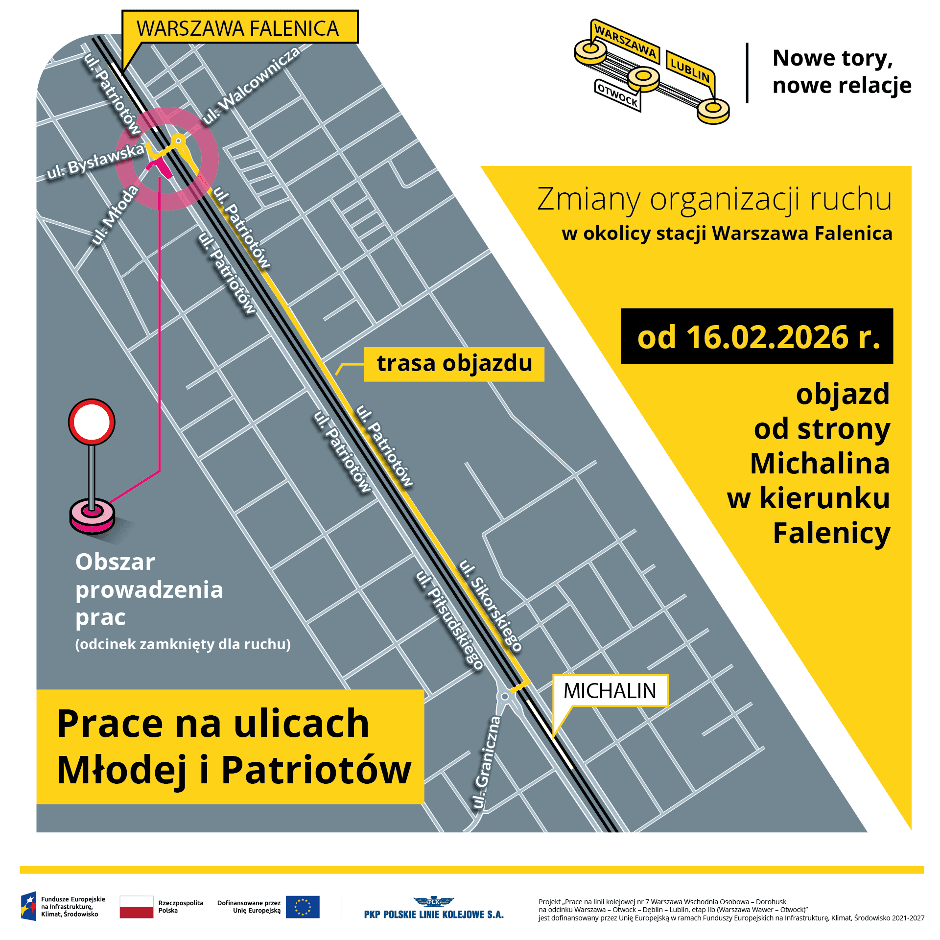 16 lutego zamknięta zostanie ul. Patriotów w pobliżu stacji kolejowej Warszawa Falenica, na skręcie w ul. Młodą. Utrudnienia potrwają około dwóch tygodni. Po ponownym otwarciu tej ulicy zamknięta zostanie ul. Bystrzycka w rejonie ul. Walcowniczej. W marcu planowane jest zamknięcie przejazdu kolejowego w Falenicy. Wszystkie te utrudnienia związane będą z pracami przygotowawczymi przed budową nowego tunelu drogowego.