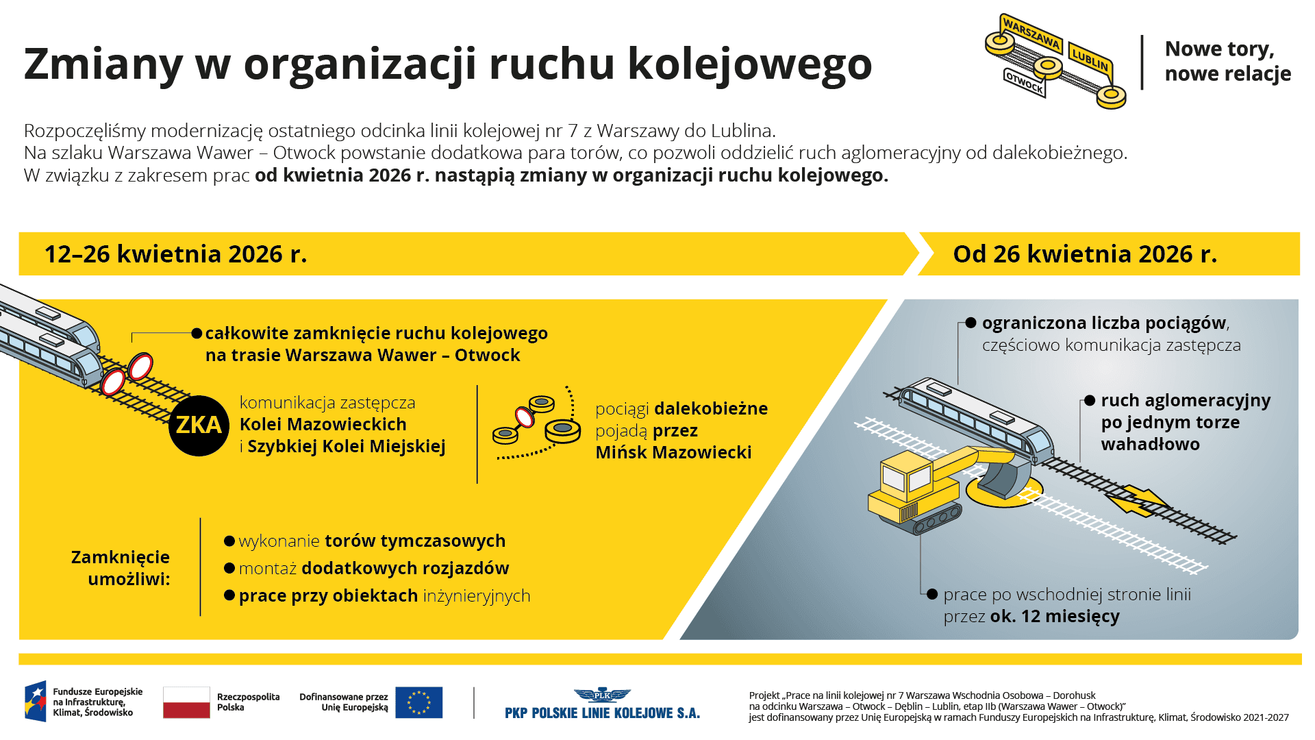 W kwietniu nastąpią także znaczące zmiany w organizacji ruchu kolejowego. Od 12 do 26 kwietnia odcinek Warszawa Wawer – Otwock zostanie zamknięty. Koleje Mazowieckie oraz Szybka Kolej Miejska uruchomią komunikację zastępczą, a pociągi dalekobieżne pojadą trasą objazdową przez Mińsk Mazowiecki. Dwutygodniowe zamknięcie szlaku umożliwi wykonawcy włączenie torów tymczasowych do istniejącej infrastruktury, montaż dodatkowych rozjazdów oraz prowadzenie robót na obiektach inżynieryjnych. Od 27 kwietnia ruch aglomeracyjny na trasie będzie prowadzony po jednym torze w obu kierunkach, a ruch kolejowy wspomagany będzie przez komunikację zastępcza. Prace będą prowadzone po wschodniej stronie linii i potrwają około 12 miesięcy.